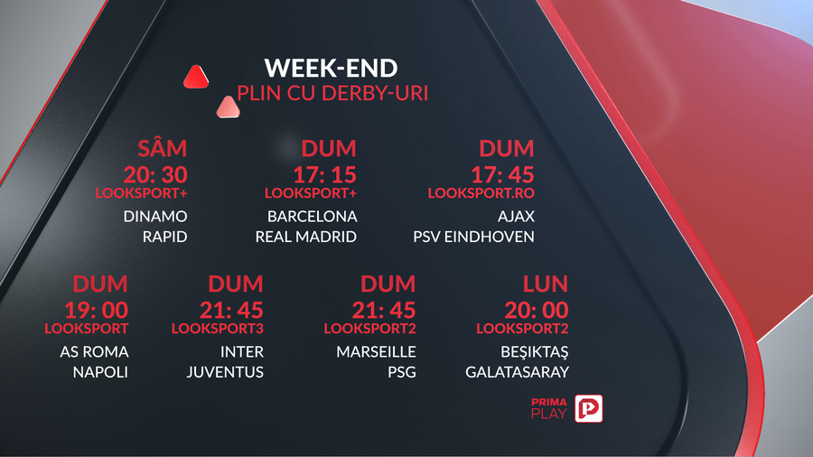 Va fi un week-end plin cu derby-uri de senzaţie, pe lângă Besiktas - Galatasaray, pe programele Look Sport. Dinamo - Rapid se joacă sâmbătă, de la 20:30, în direct pe Look Sport+, dar duminică este "Ziua Derby" în Europa. De la 17:15 minute se joacă Barcelona - Real Madrid. Cel mai urmărit meci din lume va fi în direct pe Look Sport+, iar după joc va fi o ediţie specială a emisiunii Fotbal Look. AS Roma - Napoli şi Inter - Juventus vor fi duelurile şoc din Serie A, iar Olanda vine cu un Ajax - PSV. Şi Messi va avea primul derby din Ligue 1. Va fi Marseille - PSG, de la ora 21:45.